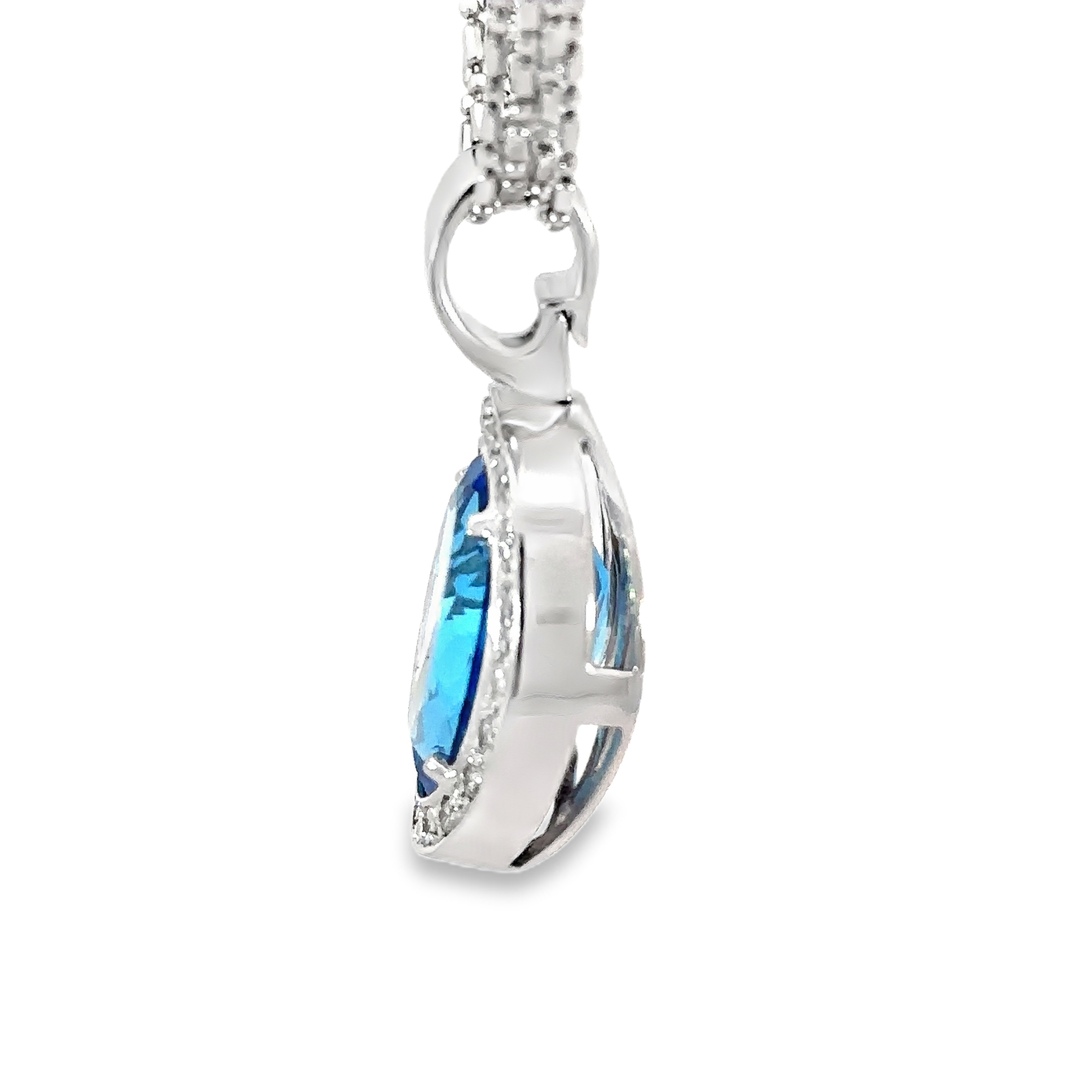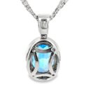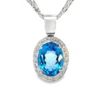 Adorn your neckline with this elegant white gold 5 strings necklace. The pendant showcases a captivating oval cut topaz, known for its exceptional brilliance and pristine clarity. The vivid blue gemstone is perfectly suspended, offering a touch of sophistication and timeless appeal to any ensemble.