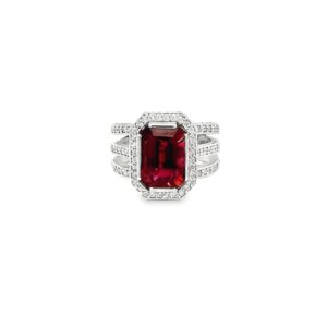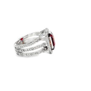 Exquisite cocktail ring featuring an oval cut ruby, known for its brilliant facets and intense red hue. The central gemstone is gracefully set in a white gold silver mounting, enhancing its vivid color and sparkle. A timeless piece, perfect for adding a touch of elegance to any occasion.