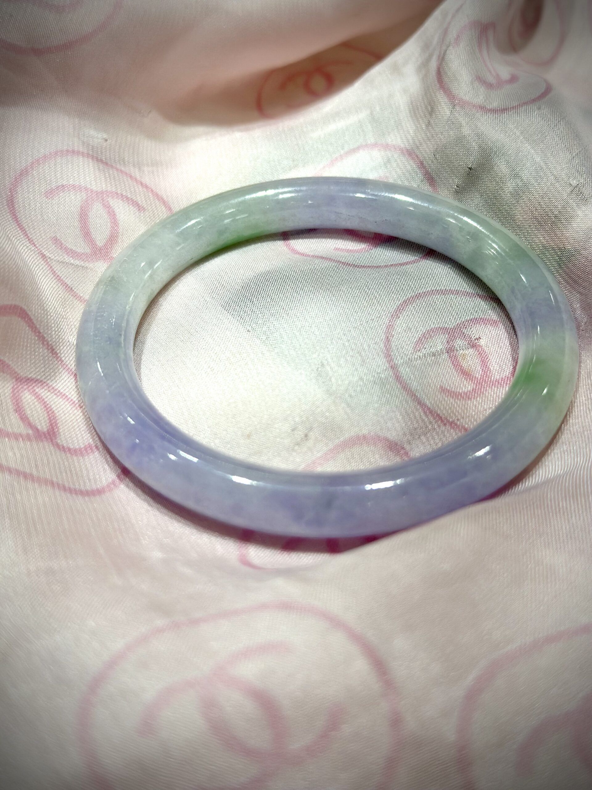 This stunning bangle features a harmonious blend of purple and green hues, expertly carved from high-quality natural jade. The purple exudes tranquility and elegance, while the green symbolizes growth and vitality. Polished to a smooth finish, this bangle combines beauty and cultural significance, making it a perfect accessory for any occasion.
