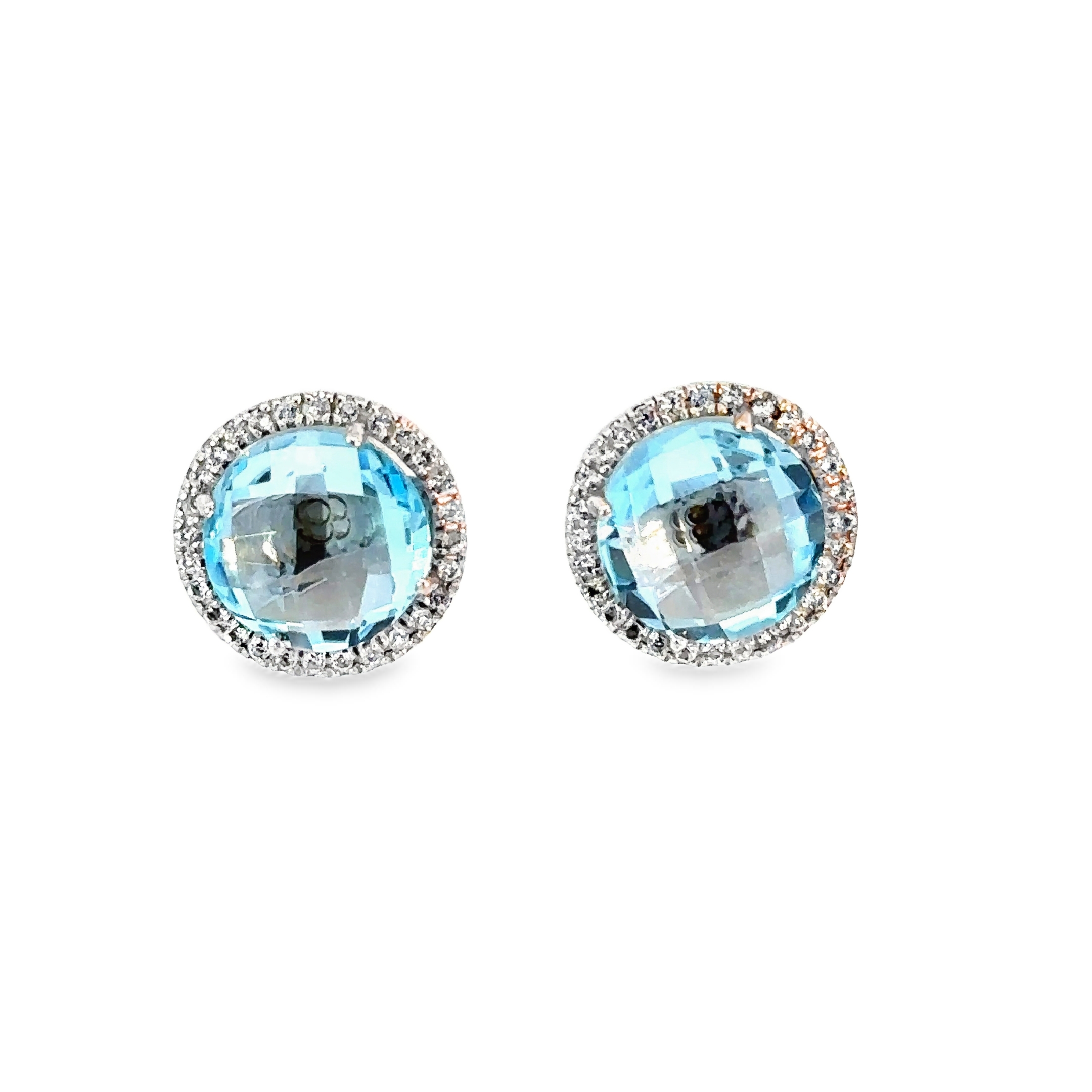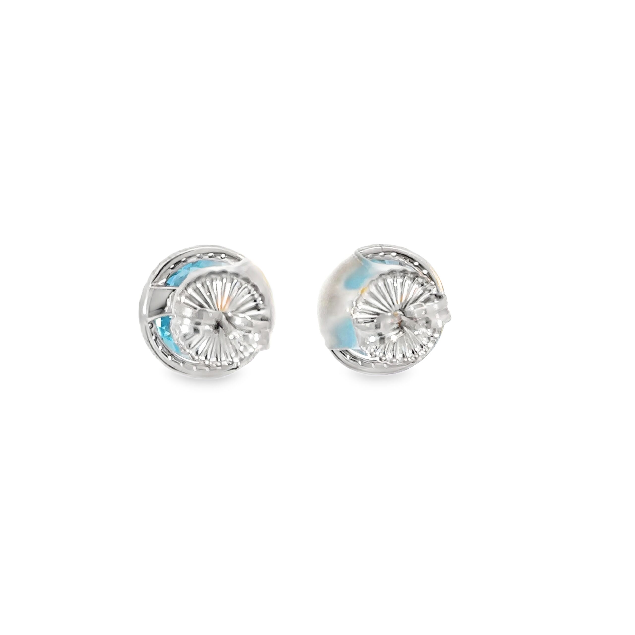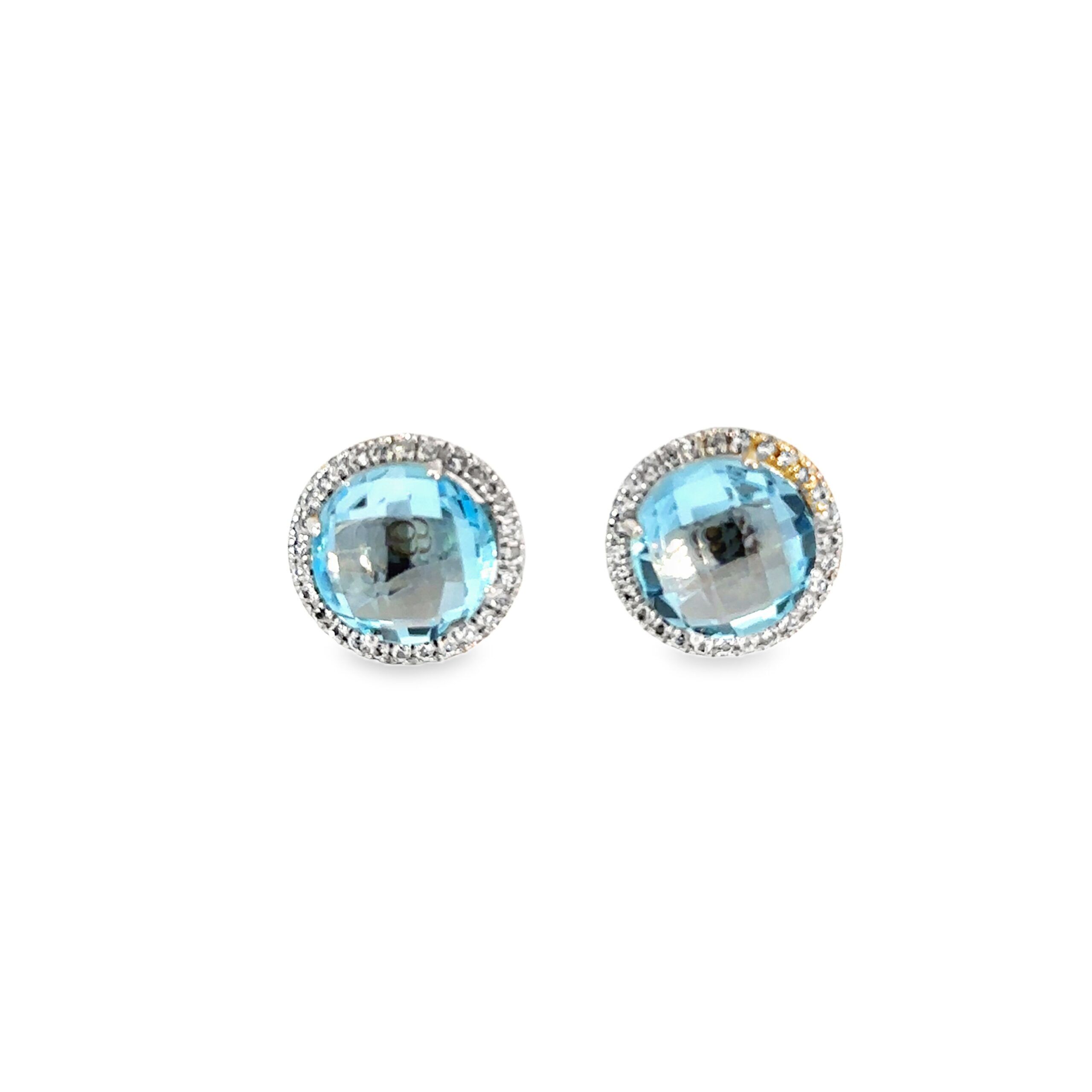Elevate your ensemble with these exquisite stud earrings. Each earring showcases a mesmerizing round-cut aquamarine, meticulously shaped in a brilliant cut to maximize its inherent sparkle and light dispersion, offering a delightful hint of bluish.